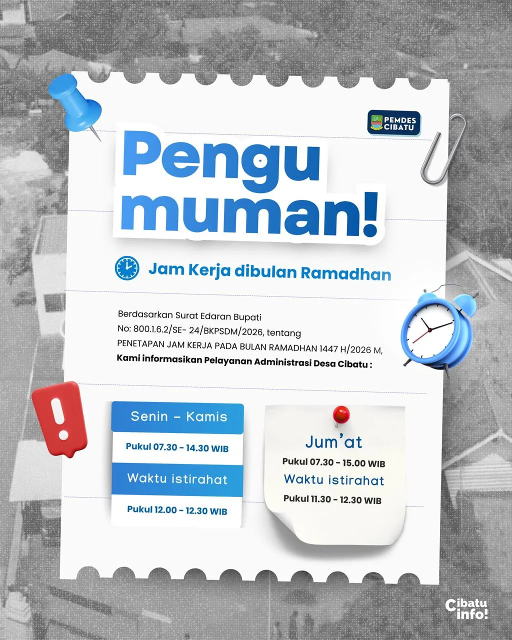 Dalam rangka pelaksanaan ibadah puasa pada bulan Ramadhan 1447 H / 2026 M, Pemerintah Desa Cibatu melakukan penyesuaian jam kerja pelayanan administrasi desa.
